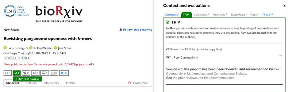 The webpage of bioRxiv preprints recommended by a PCI is automatically linked to the recommendation page on the PCIx website through the Transparent Review in Preprints (TRiP) service operated by Hypothes.is.